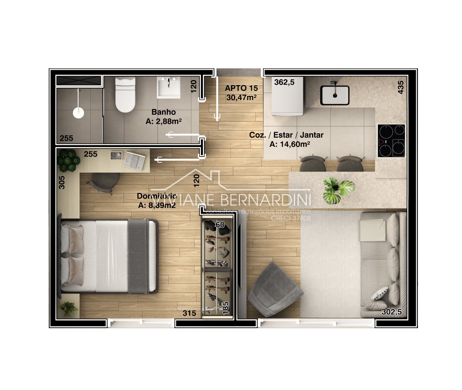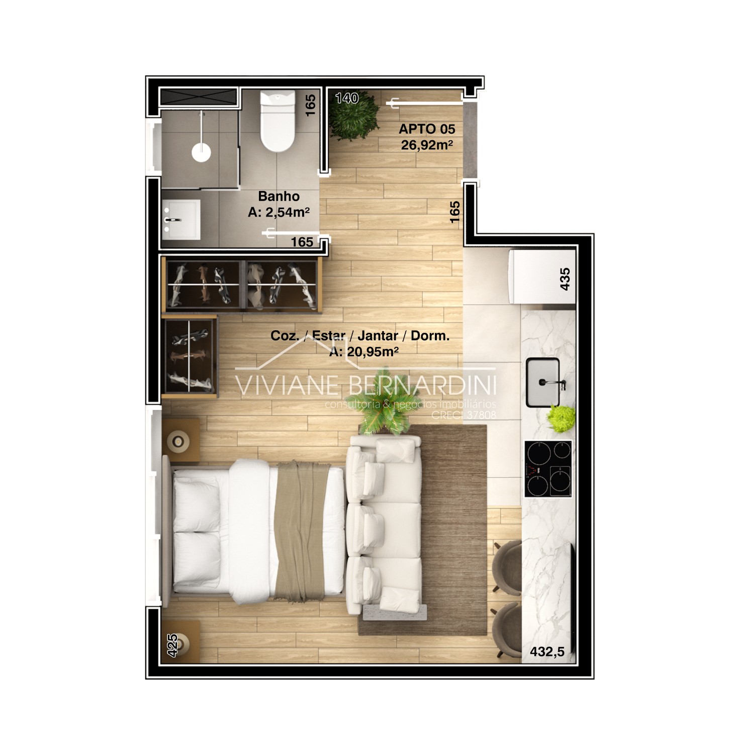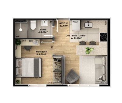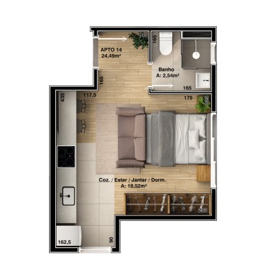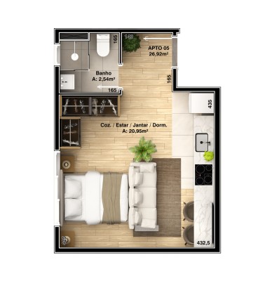Descrição › Stúdio composto de estar, cozinha, dormitório, lavanderia e banheiro social.