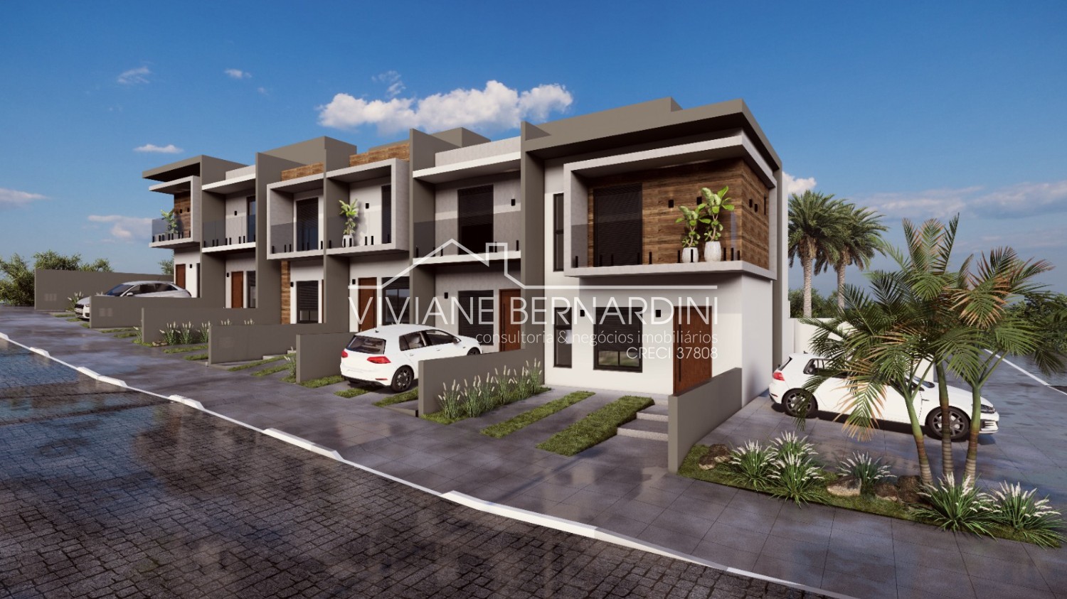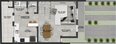 Sala estar, cozinha, área de serviço e lavabo no andar inferior.